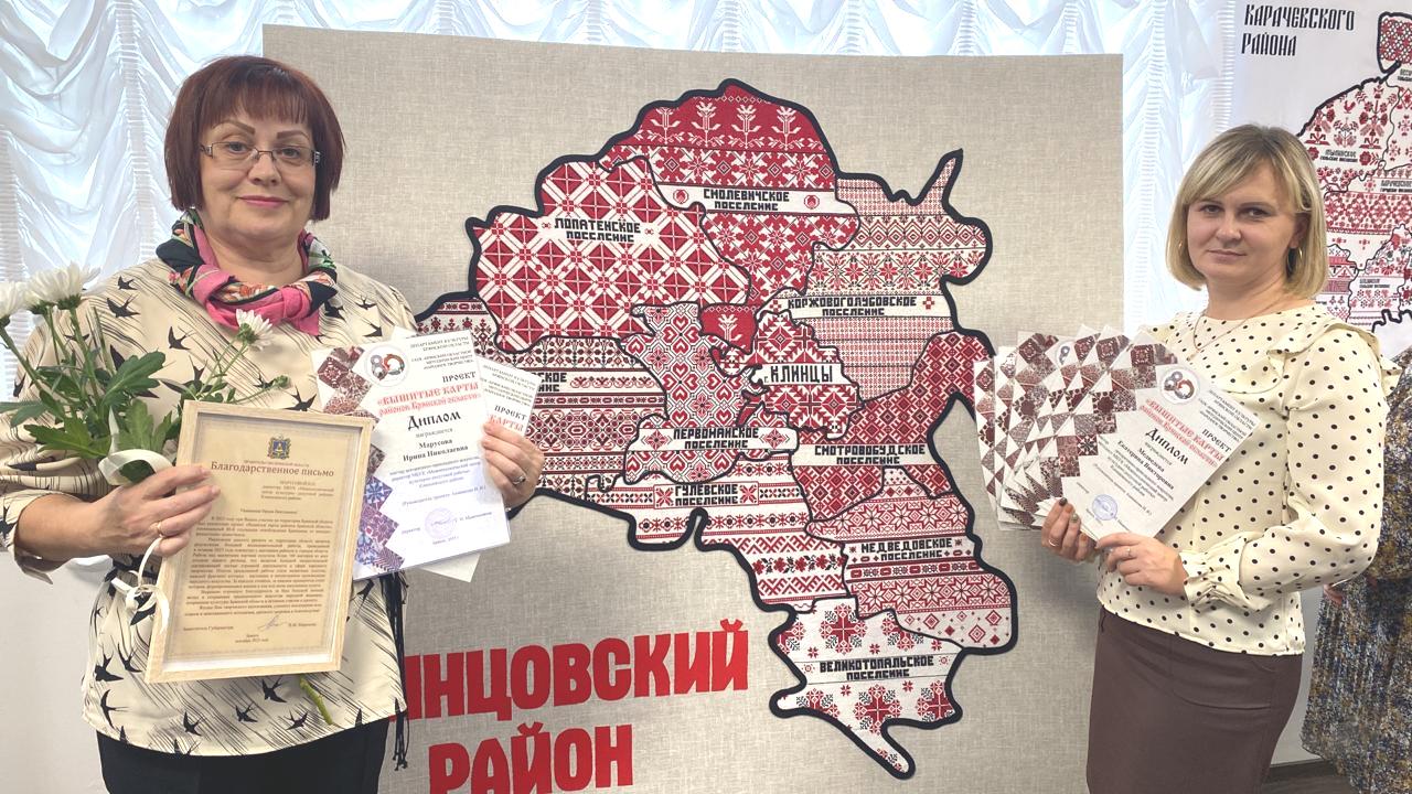 В 2023 году началась кропотливая, увлекательная работа над проектами «Вышитая карта Клинцовского района» и «Русский народный костюм Клинцовского района». Рукодельницам раздали хлопчатобумажную канву с ячейками одинакового размера, чтобы масштаб орнаментов был одинаковый, нитки мулине, обвели контуры границ и названия сельских поселений. Мастерицы творили в технике «вышивка крестиком». В орнаментах нет ни одного повторения. Рисунок вышивки копировали с рушников, одежды и других предметов старины.