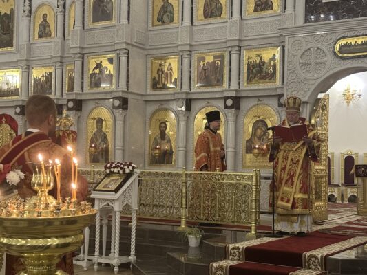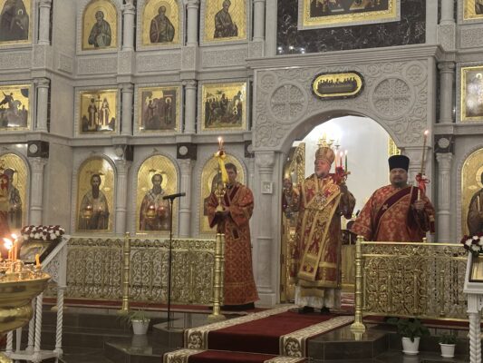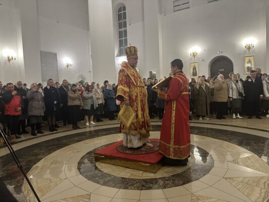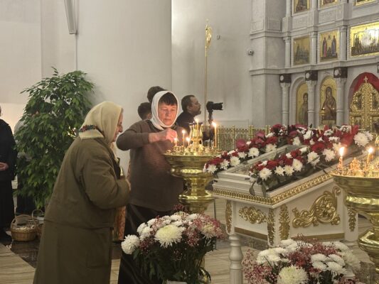По окончании богослужения состоялось освящение яств, принесенных верующим и в собор.